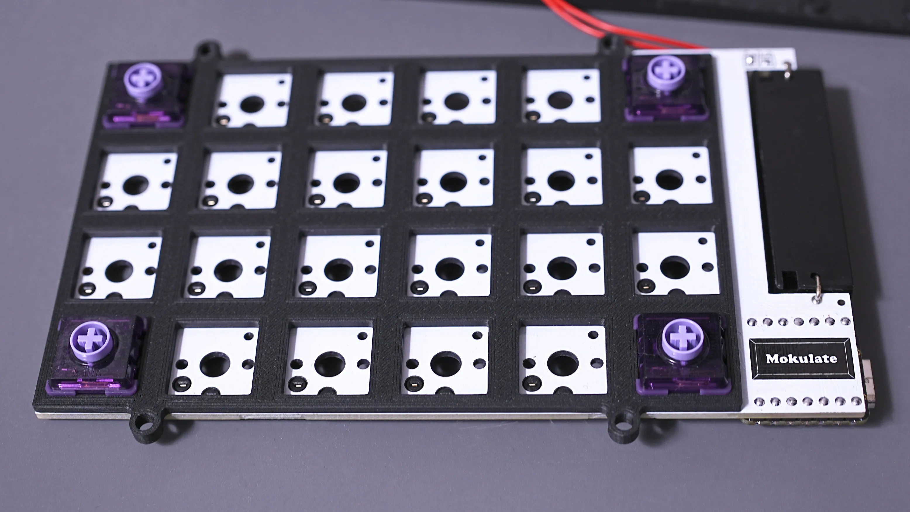- キースイッチをはめます。基板とスイッチプレートは、キースイッチを介して接合するような仕組みとなっています。