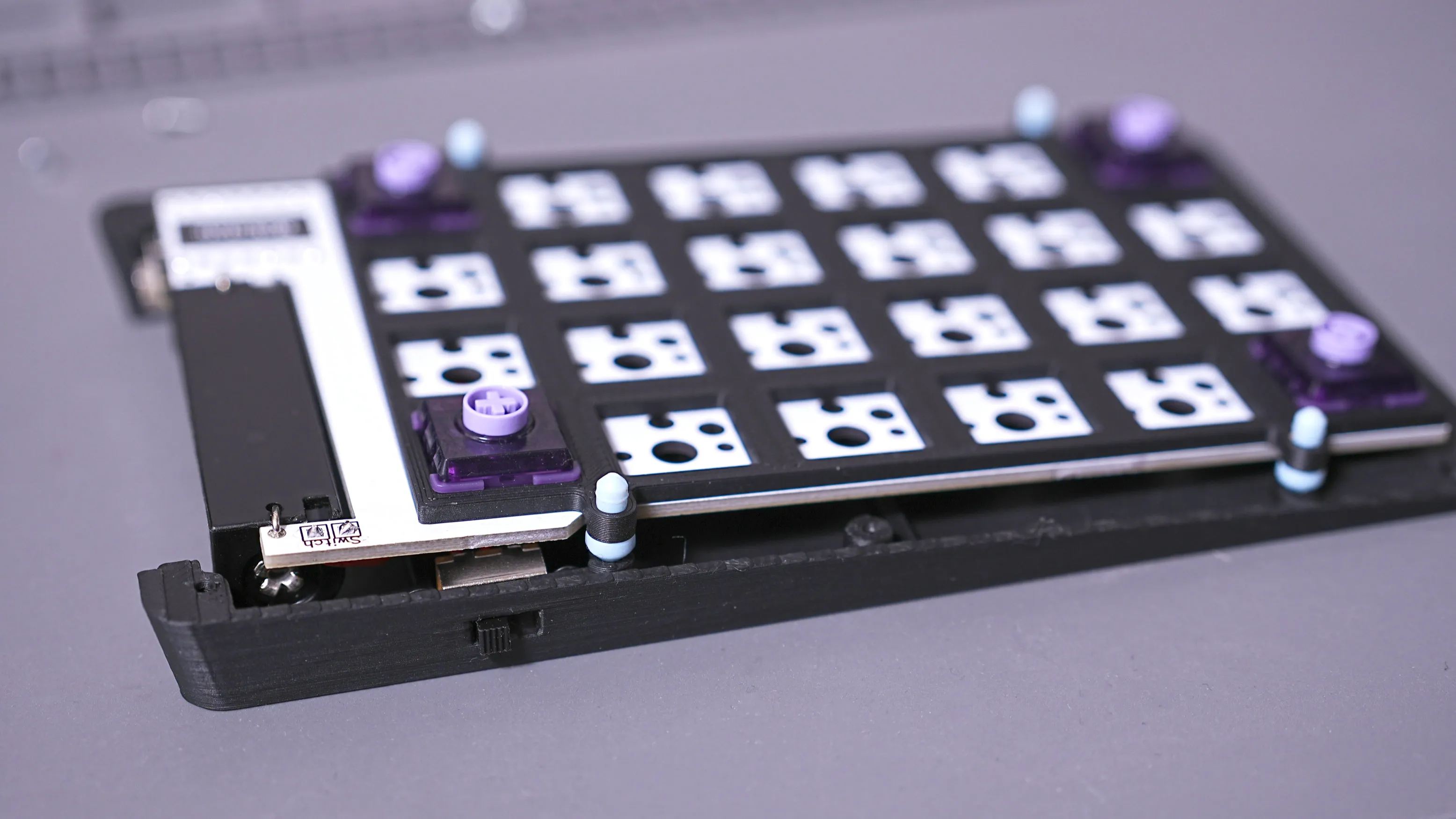 Section titled “電源スイッチの取り付け”スライドスイッチを、黒色のM2ネジ(2本)を使ってボトムケースに取り付けます。