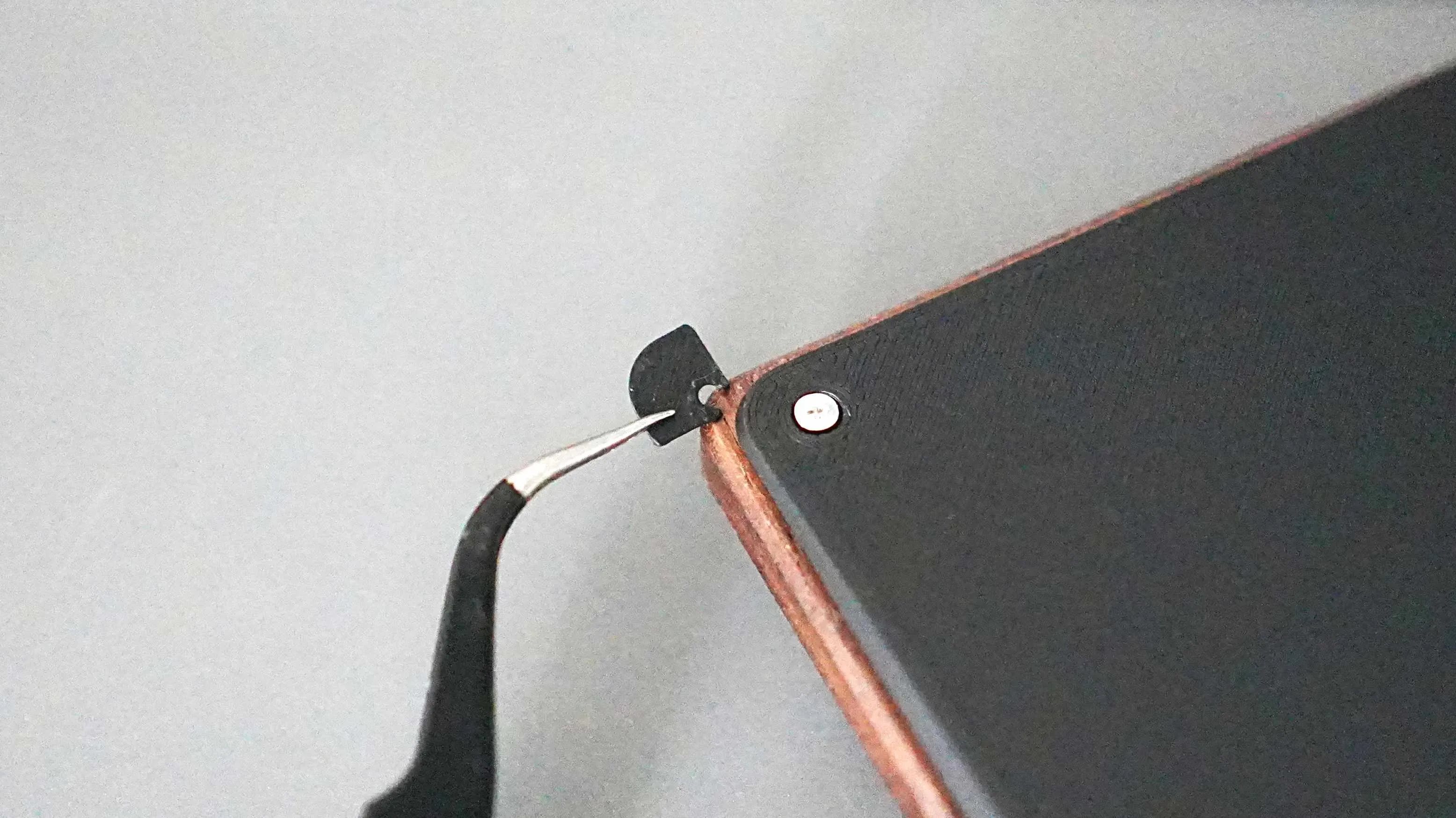 電動ドライバーではなく手回しドライバーを使ってゆっくりと締めてください。ネジが動かなくなる程度で、ほどほどにしておいてください。 - ゴム足をボトムケース裏の穴に貼り付けます。